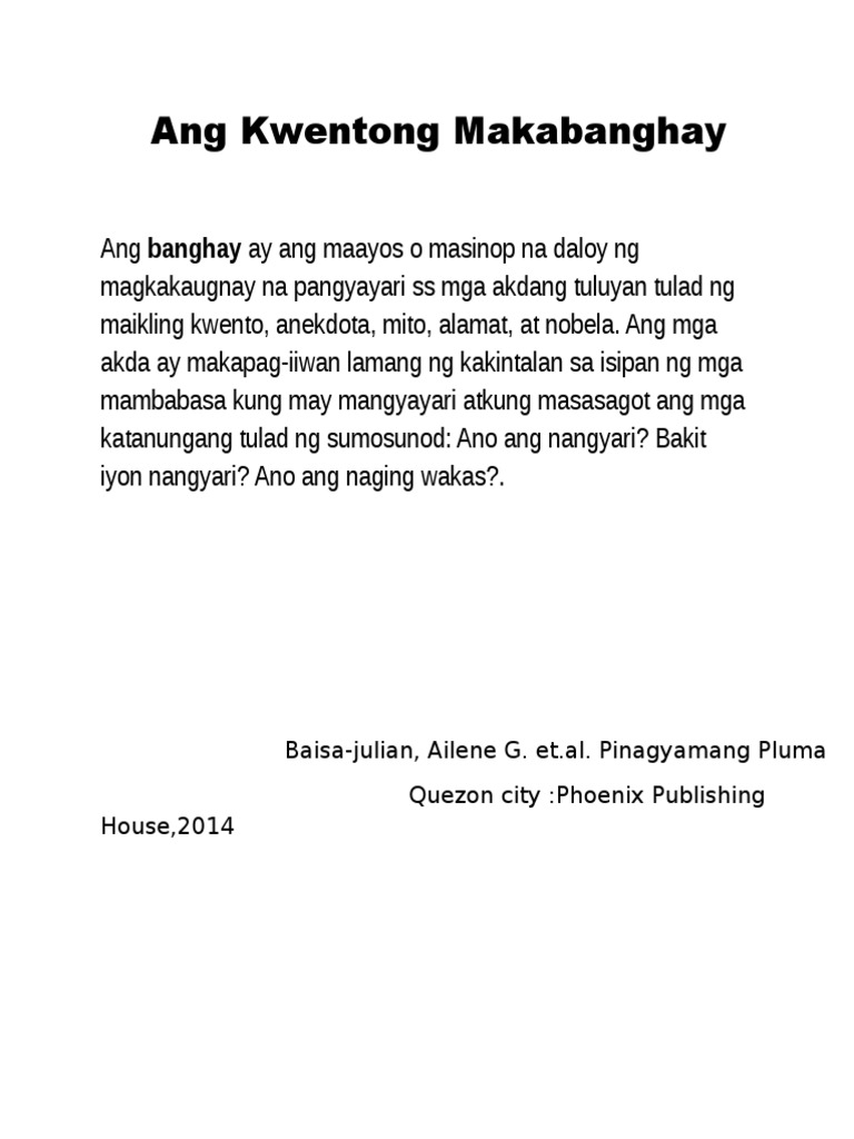 Human translations with examples. Ang kahulugan ng Makabanghay ay isa itong uri ng kwentong nag bibigay diin sa banghay o nag aayayos ng daloy ng kwento o pangyayari. 9 thoughts on Kwentong Makabanghay romel says.
