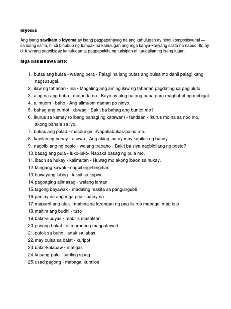 Mga Halimbawa Ng Sawikain O Idyoma Docx Mga Halimbawa Ng Sawikain O Idyoma Iba T Ibang Sawikain 1 Butas Ang Bulsa Walang Pera Halimbawa Palagi Nalang Course Hero