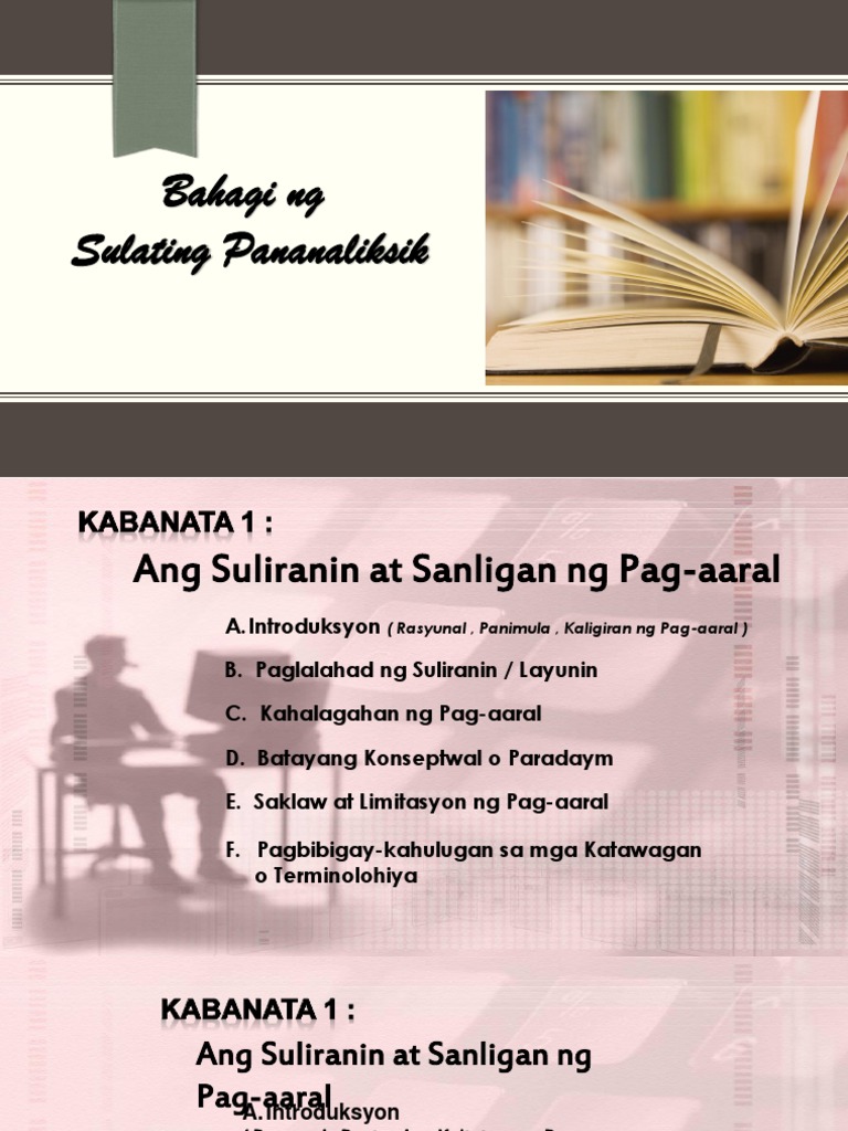 Anyo o uriKung pananaliksik pampanitikan kailangang tukuyin ang uri o genre ng susuriin sa pag-aaral maaari itong sanaysay tula dula at iba paPara sa pananaliksik sa ibang disiplina maaaring ito ang kalagayang panlipunan estruktura at iba pa. Ang layunin ng pananaliksik ay simple lamang bigyan ng solusyon ang mga problema ng lipunan. Mga Bahagi ng Pananaliksik.