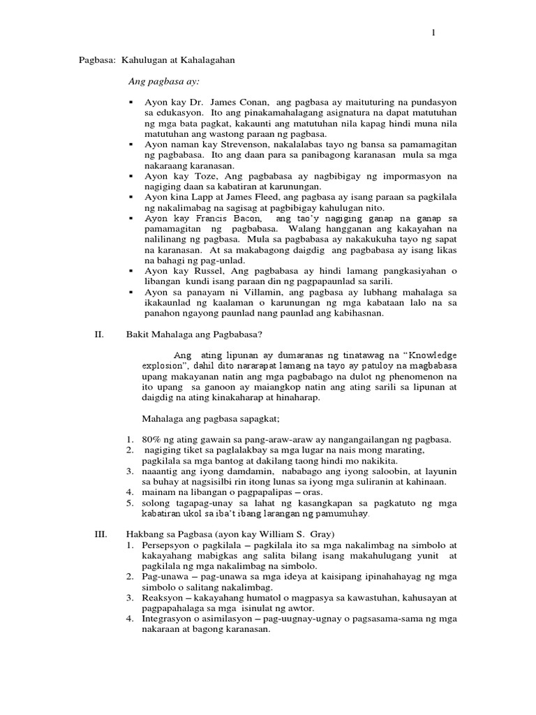 Kahulugan kahalagahan at katangian ng pagbasa pagbasa isang malawak na proseso na may kinalaman sa kakayahang pangkaisipan ng isang tao. Ang mensaheng nais iparating ng manunulat ay inuunawa at binibigyan ng interpretasyon ng mga mambabasa.