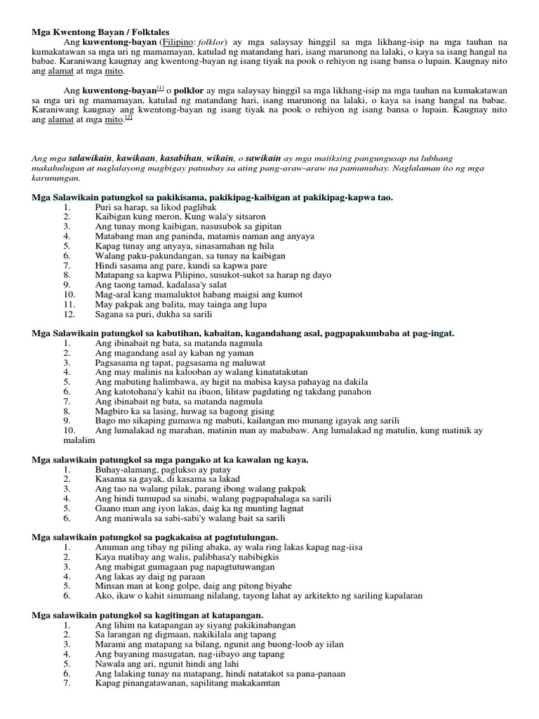 Proverbs are often metaphorical and use. Sinabi sa atin ni Hesus Gayon din naman kayo. Ang lumalakad ng matulin kung matinik ay malalim Buhay-alamang paglukso ay patay Kasama sa gayak di kasama sa lakad Ang tao na walang pilak parang ibong walang pakpak Ang hindi tumupad sa sinabi walang pagpapahalaga sa sarili Gaano man ang iyong lakas daig ka ng munting lagnat Ang maniwala.