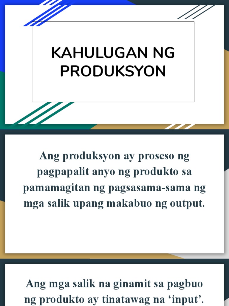 Kahulugan ng produkto sa ekonomiks. Ito ay may kaugnayan sa ekonomiks dahil ang tao hayop at halaman ay kailangan sa ekonomiya. Ang produksiyon ay proseso ng pagpapalit anyo ng produkto sa pamamagitan ng pagsamasama ng mga salik upang makabuo ng output. Ang tula ay tungkol sa kahalagahan ng ekonomiya.